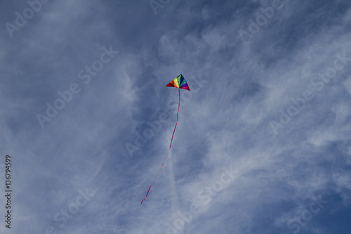 Recreational, Kite of rainbow colors on a blue sky with light wh