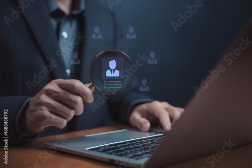 Recruitment and HR technology concept. A businessman using a magnifying glass to review a candidate profile on laptop, symbolizing hiring process, employee evaluation, and talent acquisition strategy.