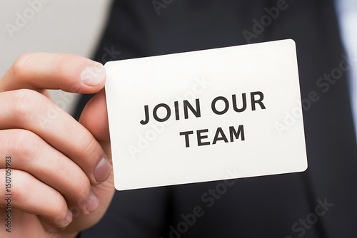 Recruitment card in hand: "Join Our Team". Find opportunities & grow with us!