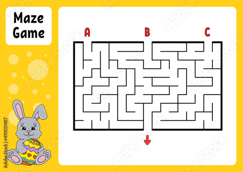 Rectangle maze. Game for kids. Three entrances, one exit. Education worksheet. Puzzle for children. Labyrinth conundrum. Color vector illustration. Find the right path. Easter theme.