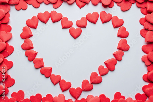 rectangular frame of small red hearts forming heart solid grey bg