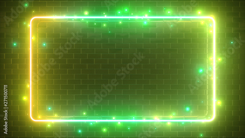 Rectangular neon sparkling luminous form on the background of a brick reflective surface. Modern ultraviolet fluorescent light spectrum. 3d illustration