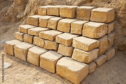 Rectangular sandstone blocks arranged in a step-like formation on a sandy surface, suggesting a construction or landscaping project