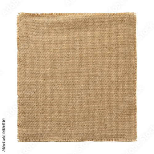 Rectangular sheet of natural unbleached burlap fabric with coarse, rustic jute fibers, laid flat on a transparent seamless studio background with shadowless top-down lighting. Concept for textile