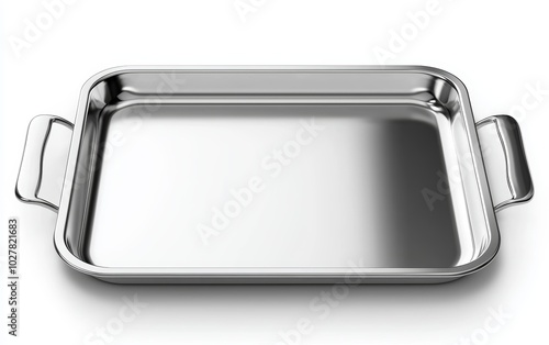 Rectangular stainless steel tray with sleek handles, isolated on a white background, perfect for modern kitchen or serving purposes