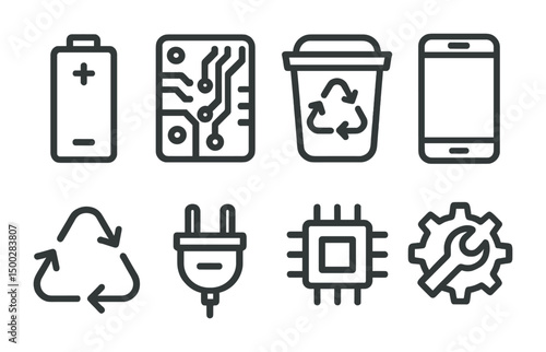 Recycling and technology outline icons set – eco, tech, linear and environmental symbols