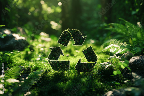 Recycling symbol against natural background with green leaves. Concept of sustainability, eco-friendliness and environmental conservation