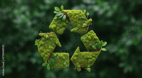 Recycling symbol made of green moss and small plants in a vibrant natural setting