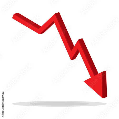 Red 3d arrow going down stock icon on white background. Bankruptcy, financial market crash icon for your web site design, logo, app, UI. graph chart downtrend symbol.chart going down sign.