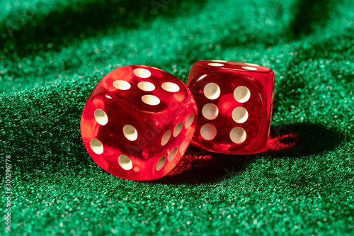 Red acrylic transparent dices for games. Two gambling translucent dices on green velvet surface, close-up.