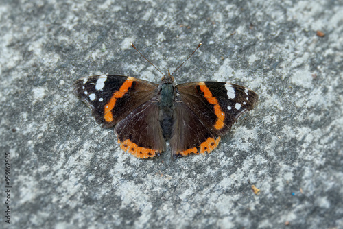 Red admiral butterfly (Vanessa Atalanta) sitting on stone path in Zurich, Switzerland