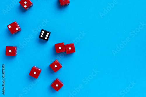 Red and black gaming dices on blue background. Flat lay, game concept.