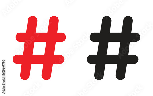 Red and black hashtag symbols, representing social media trends and online communication isolated on white background