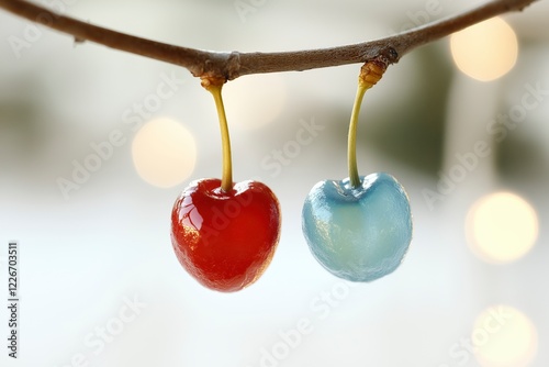 Red and Blue Candied Cherries Hanging from a Branch with Soft Background Bokeh Effect