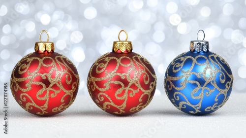 Red and Blue Christmas Ornaments on Sparkling Surface