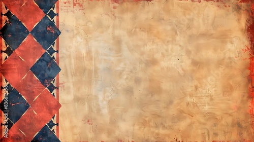 Red and blue diamonds on left border, soft peach background.