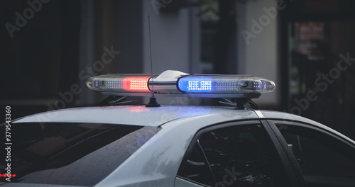 Red and blue light flasher. Police car in the city
