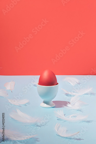Red and blue vintage Easter composition with Easter egg and white feathers. Minimal, trendy concept.
