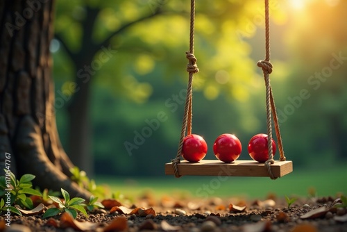 Red and gold balls hanging from a wooden swing suspended in the air, swing, suspended