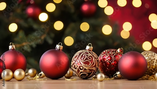 Red and Gold Christmas Ornaments on Wooden Table with Bokeh Lights