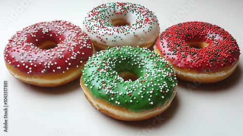 Red and Green Donut Concept Perfect for Christmas Themes. Colorful holiday donuts with icing and festive sprinkles arranged in a circle showcasing red green and white colors perfect for celebrations