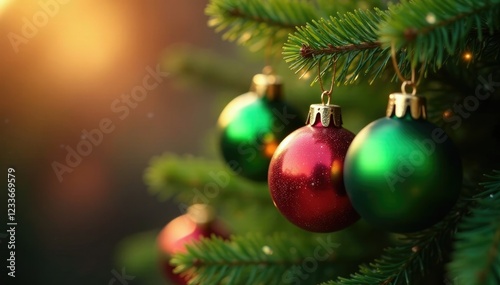 Red and green glass ornaments adorning a fir tree branch, fir, glowing, bright