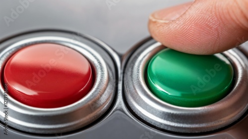 Red and green industrial buttons in close-up. Ideal for control systems, industrial processes, and technology interfaces.