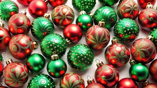Red and green ornament pattern on a white background with a metallic sheen, ornament patterns, holiday decor, sparkling details