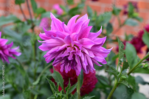 Red and pink Dahlias in the garden on a Bush