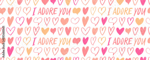 Red and pink hearts seamless banner background with phrase I adore you. Crayon drawn cute hearts, linear and silhouette elements. Retro romantic background print. Valentine's day seamless pattern.
