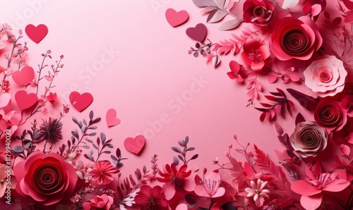 Red and pink paper hearts and floral elements scattered on a pink gradient background.