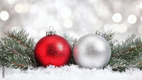 Red and Silver Ornaments Resting on Snowy Branches