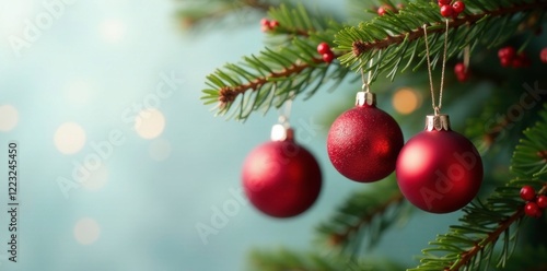 Red and white berries hang from a green evergreen branch with matching ornaments, red, ornaments, festive