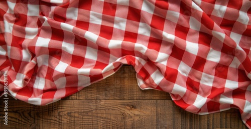 Red and white checkered tablecloth on a wooden background with copy space, in a top view.