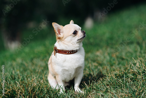red and white chihuahua sitting on green grass in park in sunny summer day, dwarf dog breed, dogwalking concept