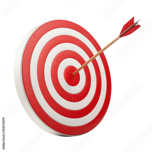 Red and white circular target board with an arrow perfectly hitting the bullseye in the center isolated on transparent background