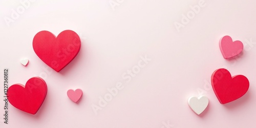 Red and white paper hearts on light pink background. Valentine's day flat lay composition. Romantic holiday decor elements for greeting cards and love messages with copy space