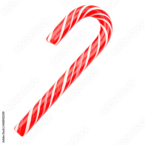 Red and white striped candy cane with a curved hook shape, commonly associated with Christmas and holiday celebrations