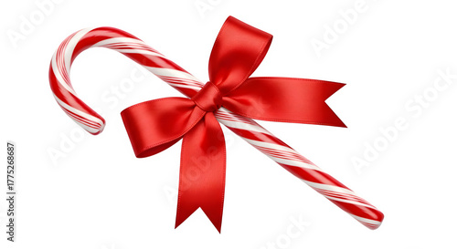 Red and white striped candy cane with a shiny red ribbon bow isolated on transparent background