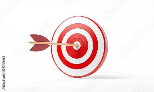 Red and white target with wooden arrow in the center on a white background achieving goal