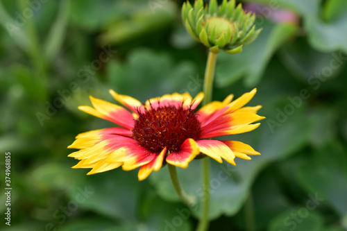 Red and yellow Gaillardia flowers in the garden greenery