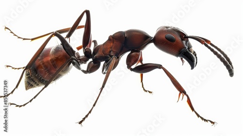 Red ant walks on white, showing its detailed anatomy. Close-up reveals legs, exoskeleton, and antennae. Nature's wildlife captured in macro image