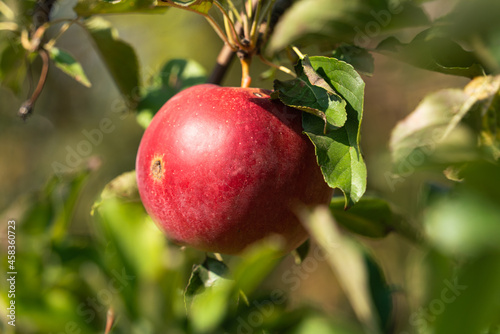 Red apple hanging on a green branch of an apple tree in early autumn in September