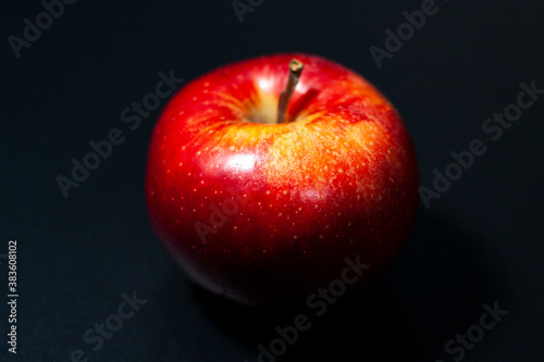 Red Apple on a dark background. The fresh stalk is turned towards the lens.