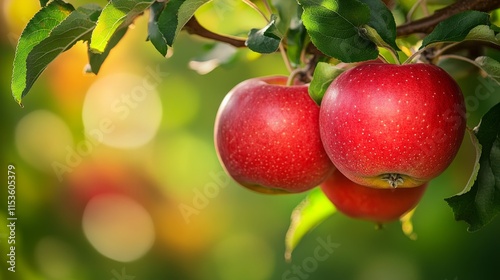Red apples hanging on a branch create a vibrant scene, showcasing the beauty of an apple on a tree, with the red apple adding charm to the picturesque garden setting.