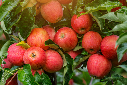 Red apples on a tree.Ripe Apples in the Apple Orchard before Harvesting. Apple orchard. Basket of Apples.Morning shot