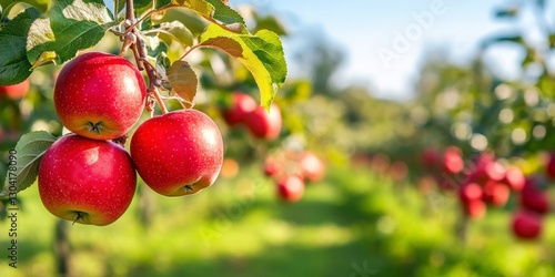 Red apples on an apple tree branch in an orchard against a blue sky on a sunny day, with a background of green trees and grass