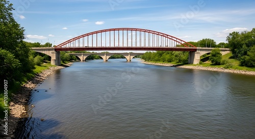 Red Arch Bridge Spanning a Wide River on a Sunny Day.
