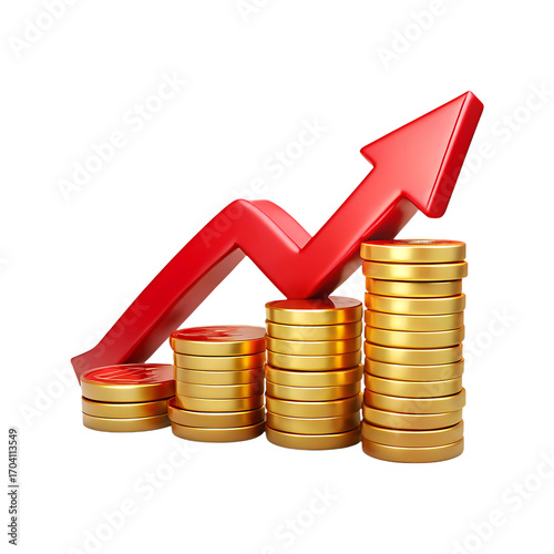 Red arrow graph shows upward trend over stacks of gold coins finance concept transparent background