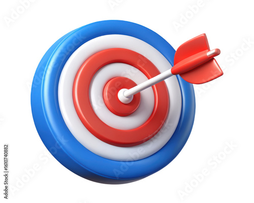 Red arrow hitting the bullseye target center 3d render illustration on background achieving success and goals for business and marketing